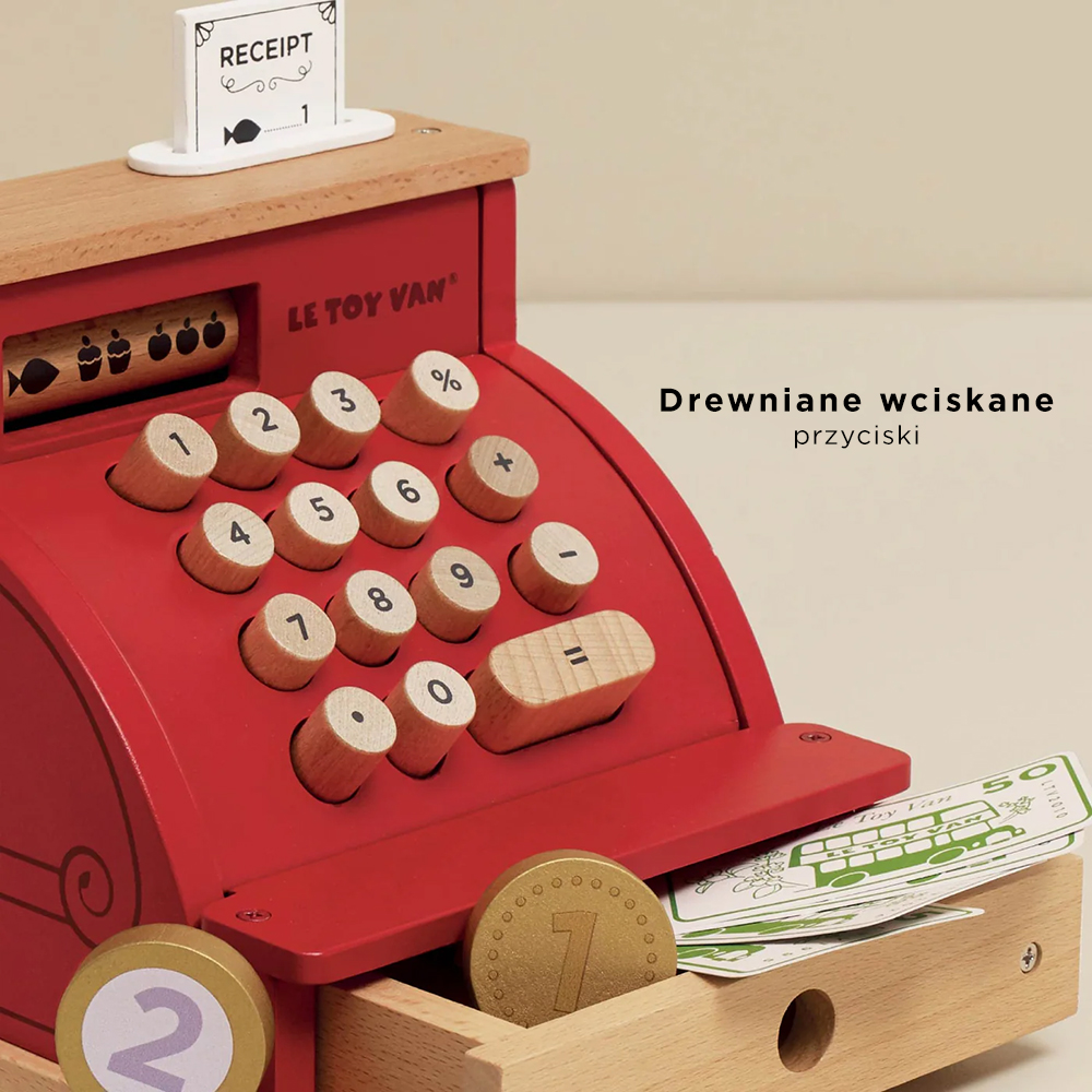 Piękna czerwona, stylizowana na retro kasa zawiera akcesoria do radosnej i kreatywnej zabawy w sklep: drewniany paragon, łatwo otwieraną szufladę na pieniądze, obrotowy ilustrowany wyświetlacz oraz drewniane i papierowe pieniądze. Zabawka nie zawiera plastiku, daje autentyczne wrażenia z obsługi kasy podczas zabawy i stanowi doskonały sposób na wczesną naukę matematyki.