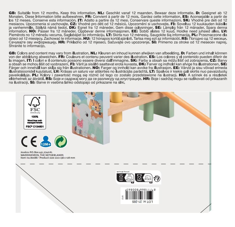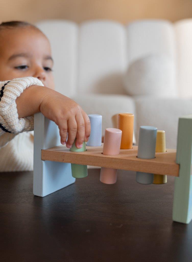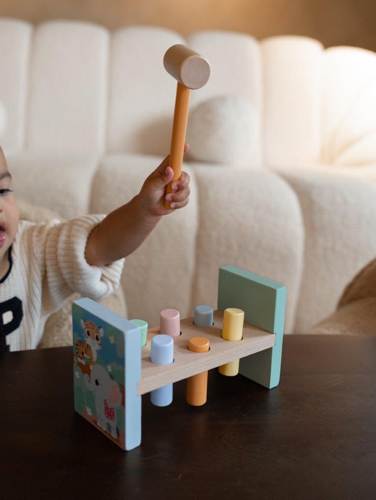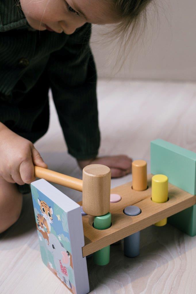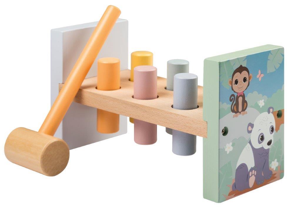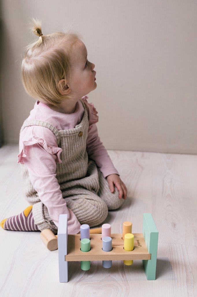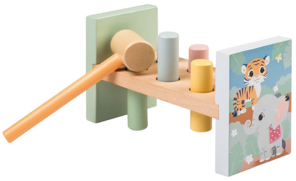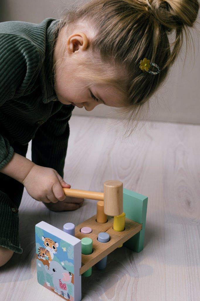 składa się z pastelowej drewnianej ławeczki, młotka oraz 6 kolorowych kołków.