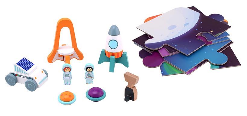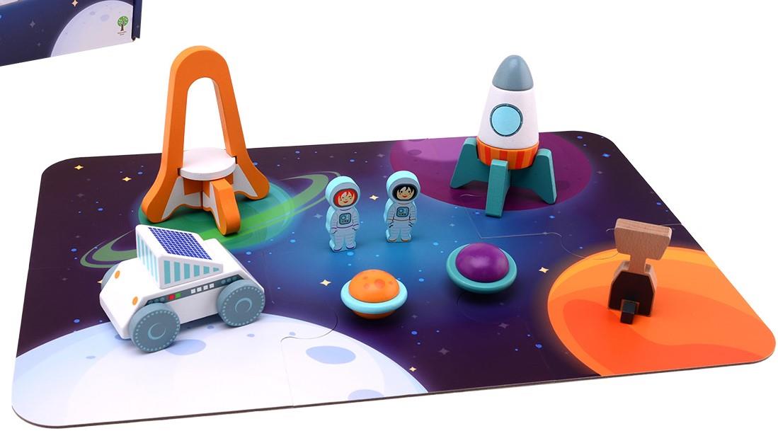 rozmieszczenie kosmicznych przedmiotów. Drewniane zabawki w postaci ludzików