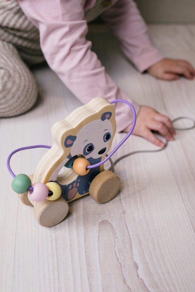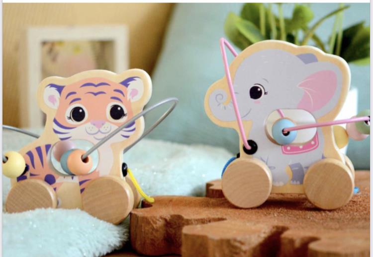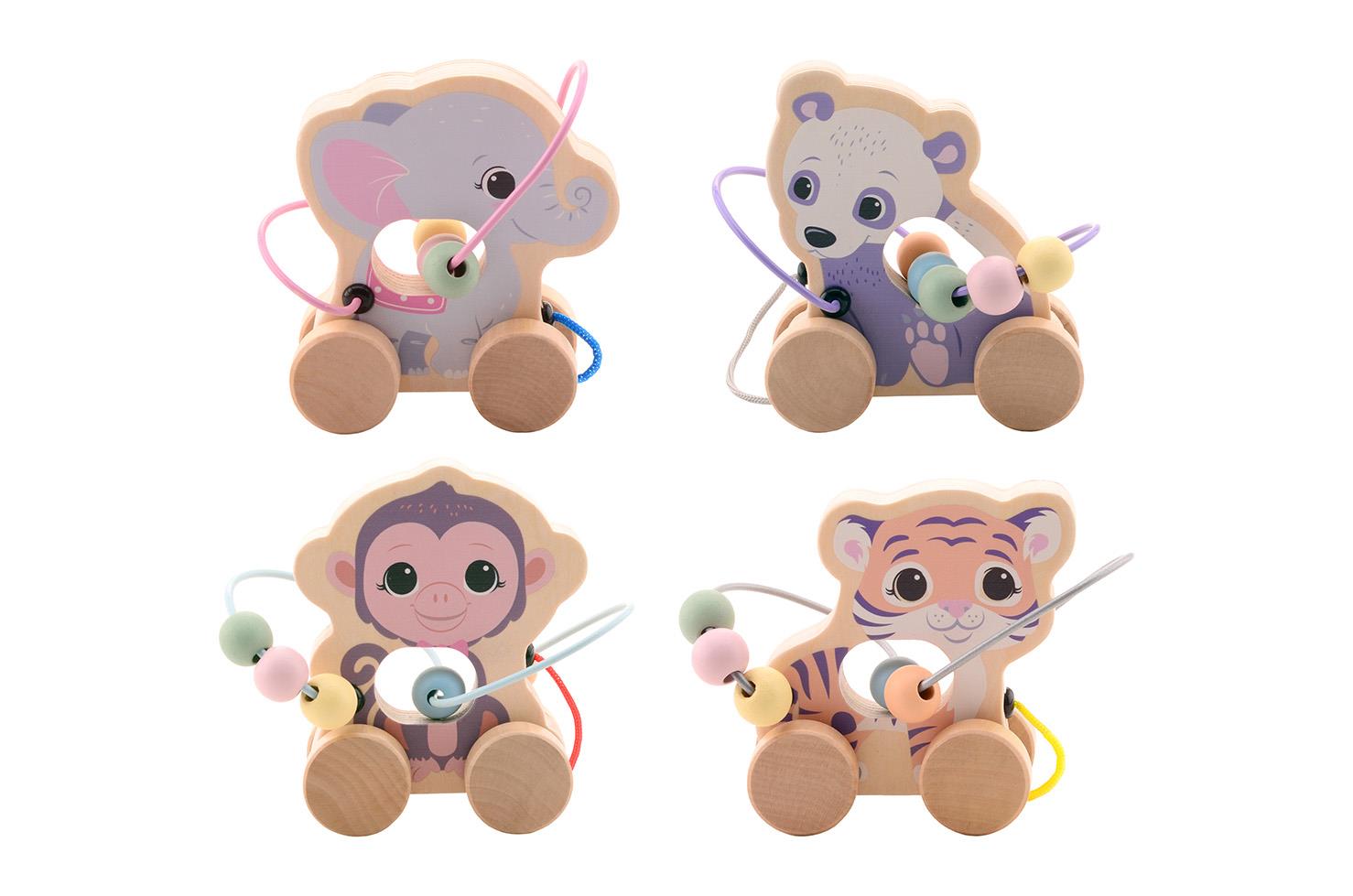Drewniane zwierzątka na kółkach z przeplatanką i sznurkiem