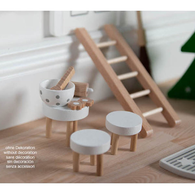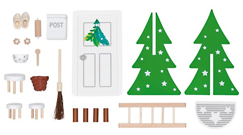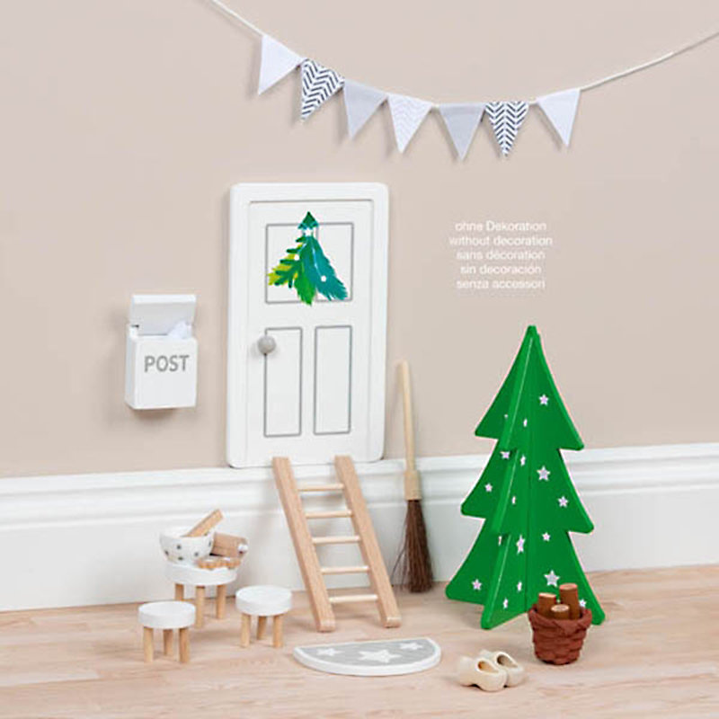 Zestaw drewnianych akcesoriów do domku dla lalek i pokoju dziecięcego Drzwi Elfa marki Goki. Wystarczy przymocować drewniane drzwi i skrzynkę na listy do ściany za pomocą kropek kleju i po cichu pilnować drzwi. Ale bądźcie ostrożni! Nigdy nie otwieraj drzwi, bo wtedy elf straci swoją magiczną moc! Odgrywanie scenek z udziałem laleczek wpływa na rozwój wyobraźni i kreatywności dziecka. Zestaw ten zawiera: drzwi, drabinkę, skrzynkę na listy, wycieraczkę, miotłę, dwie drzewka świąteczne, buciki, wałek do ciasta, foremki, miskę, drewnianą łyżkę, trzy taborety i drewno wraz z wiklinowym koszykiem.