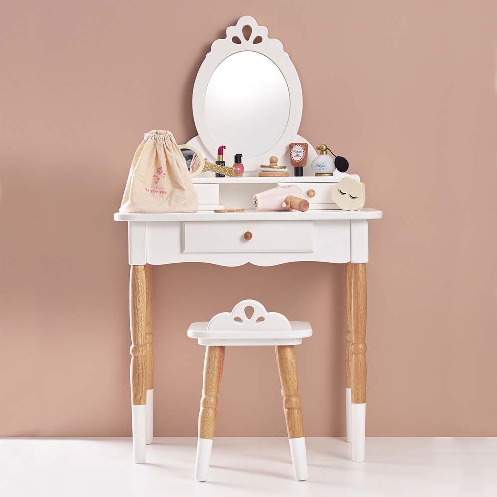 Ten wielokrotnie wyróżniany i nagradzany komplet mebli dla dzieci w stylu vintage zawiera bogato zdobioną toaletkę z owalnym lustrem i taboret.