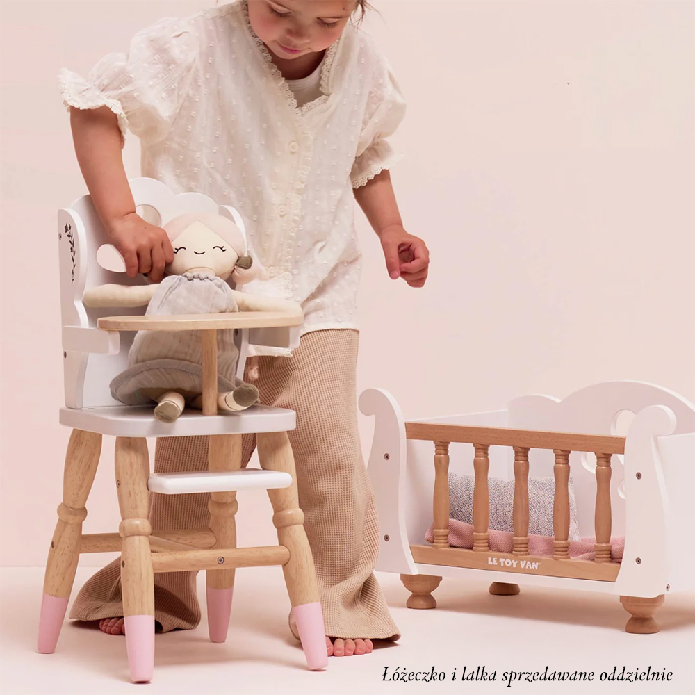 Krzesełko zawiera przemyślane detale – toczone nogi, kwiatowe zdobienia, tacę i podnóżek, dzięki czemu stanowi doskonałe rozwiązanie do karmienia głodnych zabawek w ramach realistycznej i rozwijającej kompetencje społeczne zabawy.