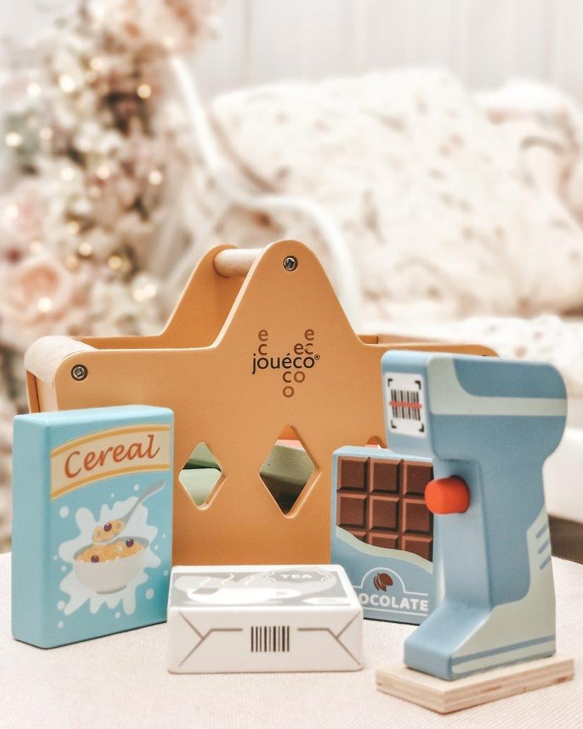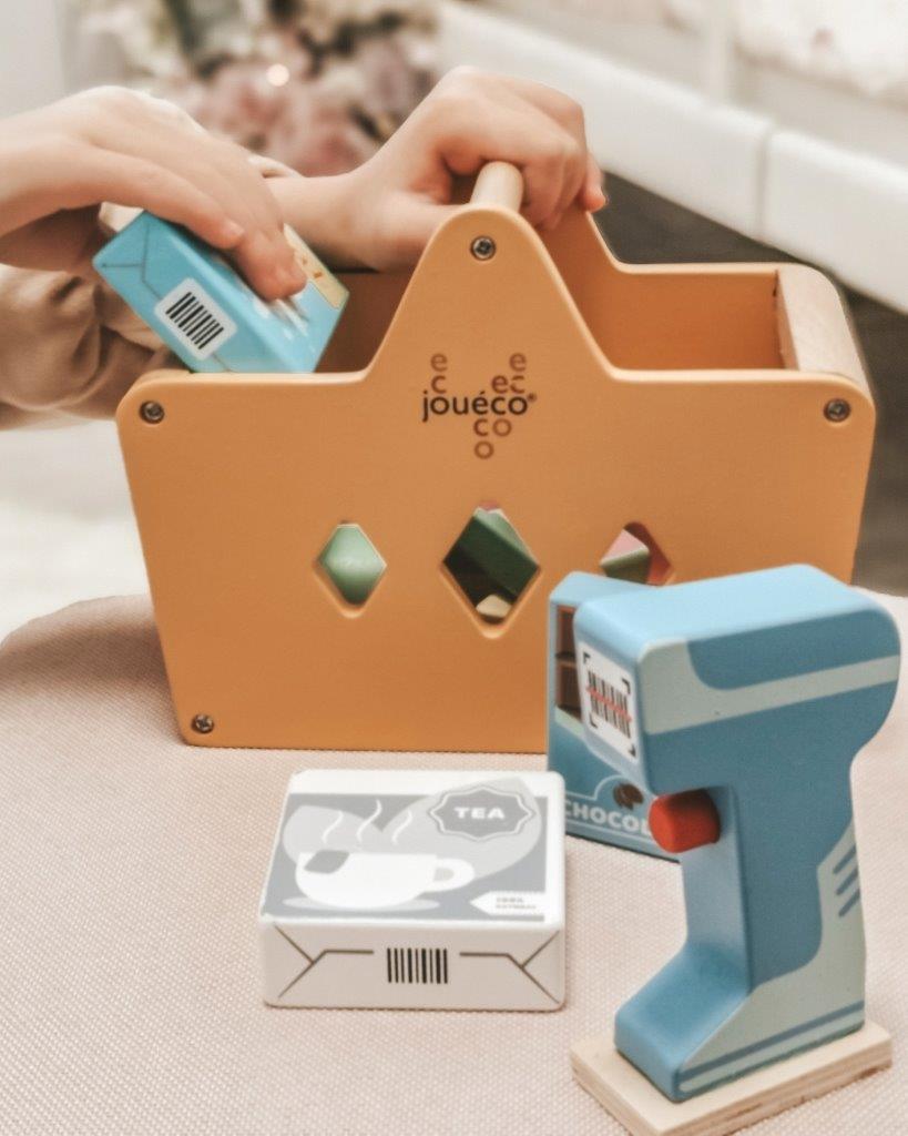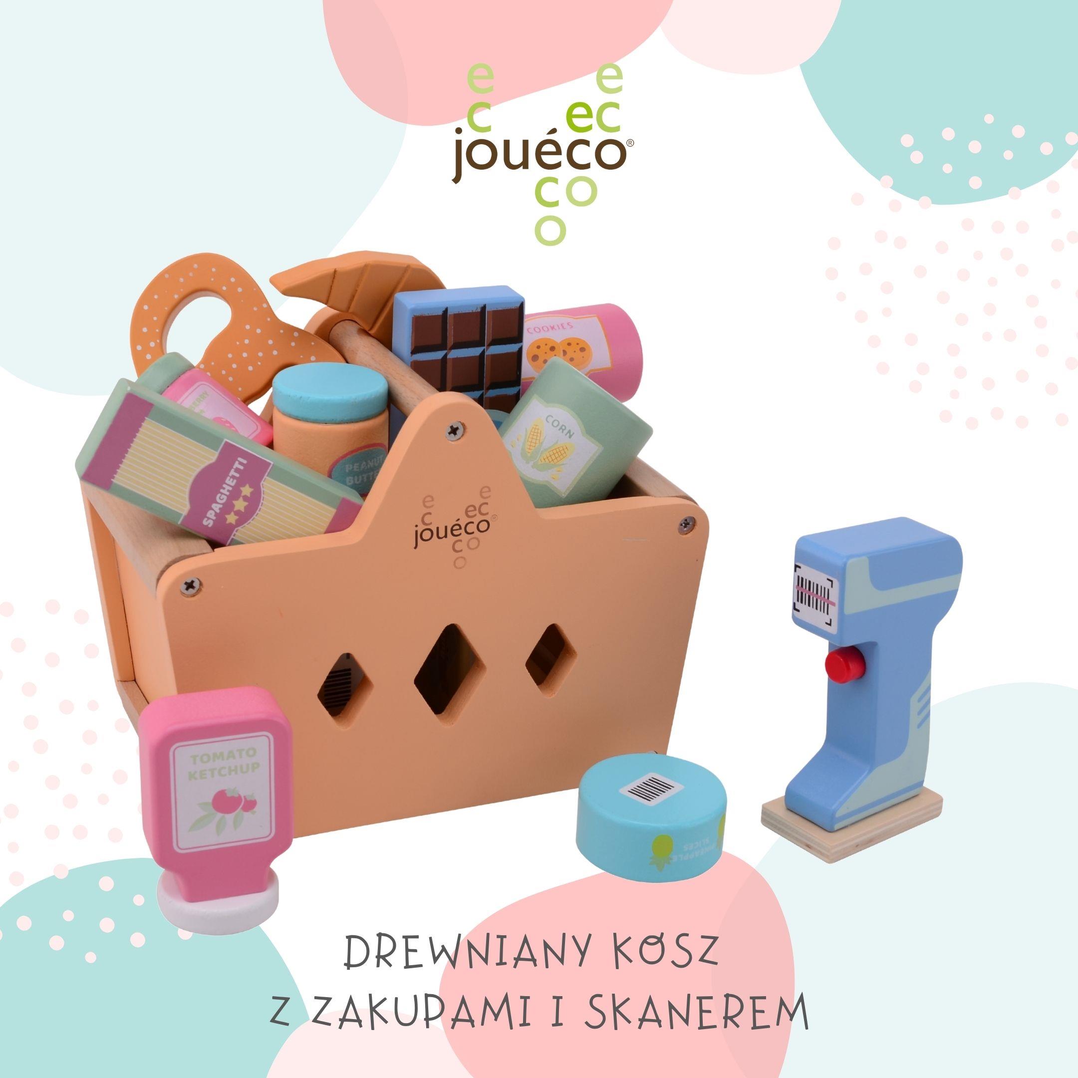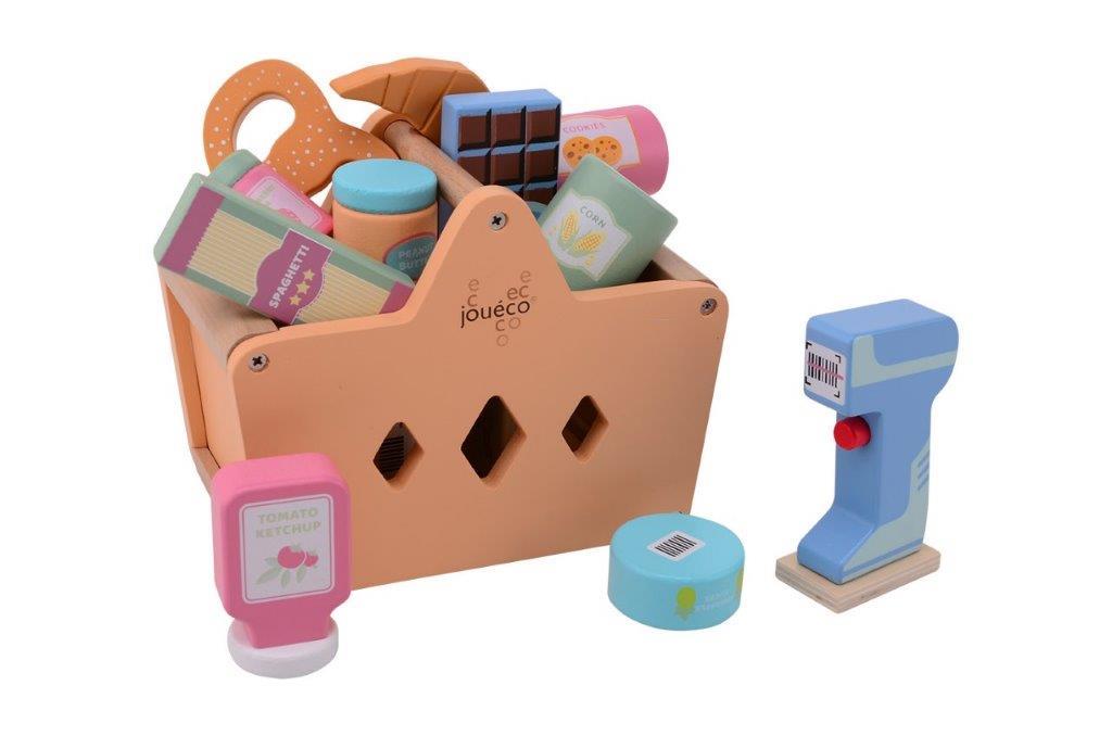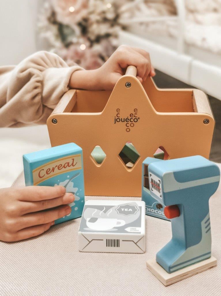 Drewniany kosz z zakupami i skanerem JOUECO jest wyjątkowo