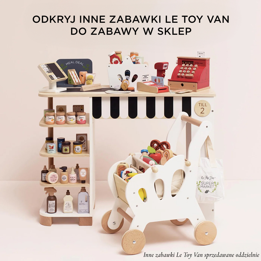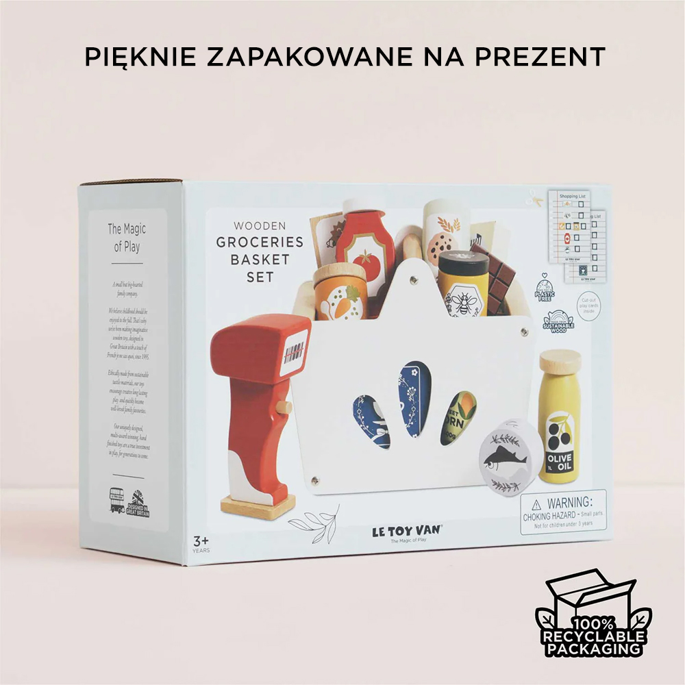 Koszyk z zakupami zawiera 14 elementów: koszyk na zakupy, artykuły spożywcze (puszka tuńczyka, miód, masło, ciasteczka, słodka kukurydza, keczup, oliwa z oliwek, makaron spaghetti, czekolada, herbata, jedzenie dla dzieci, płatki śniadaniowe) i skaner kodów kreskowych. Połącz ten zestaw z innymi zabawkami z marki Le Toy Van.