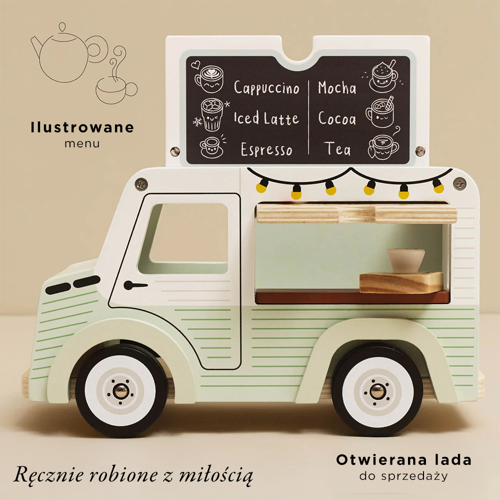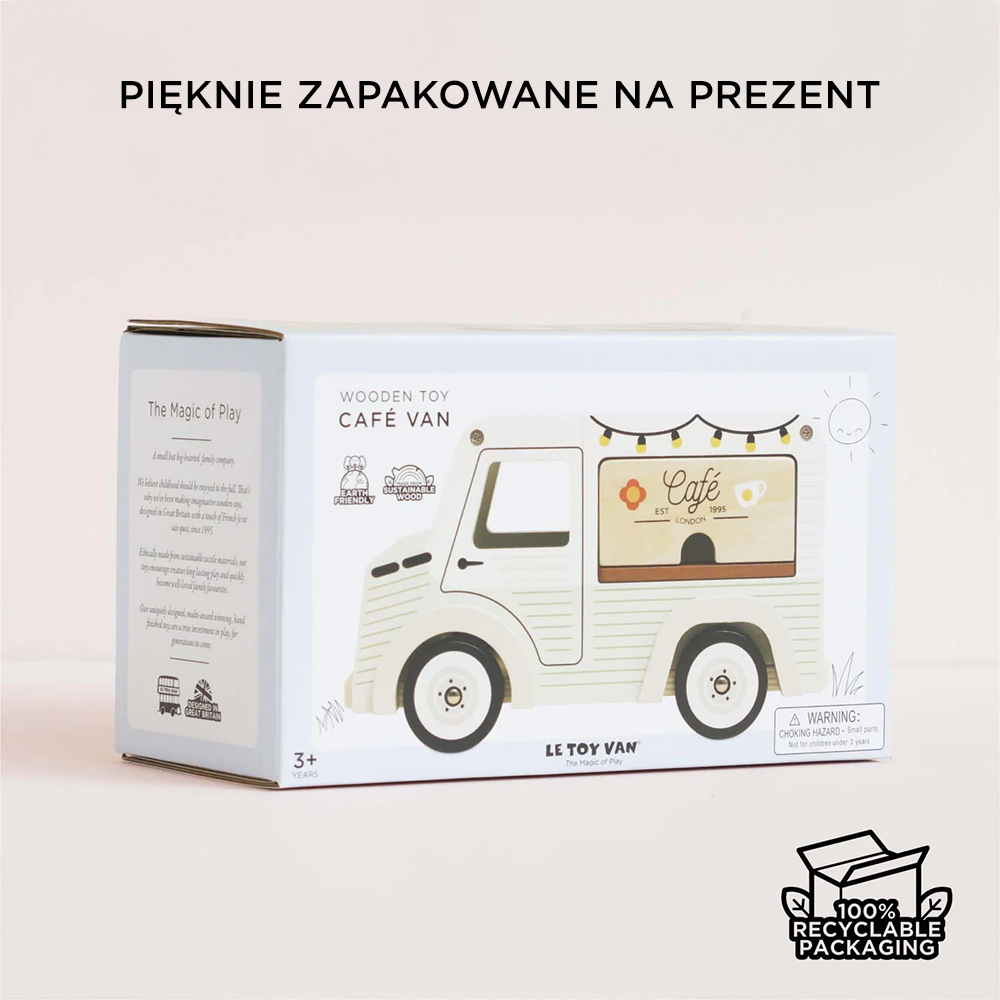 Kawiarnia w stylu retro jest wyposażona w podnoszony dach z menu, słodkie okienko do podawania kawy i herbaty, markizę oraz drewnianą tacę do serwowania. Jej rozmiar idealnie pasuje do gamy drewnianych lalek, akcesoriów oraz pięknych, wielokrotnie nagradzanych domków dla lalek marki Le Toy Van. Czas spędzony z tym klasycznym, miniaturowym samochodzikiem – kawiarnią jest najsłodszy!