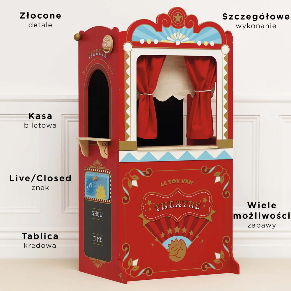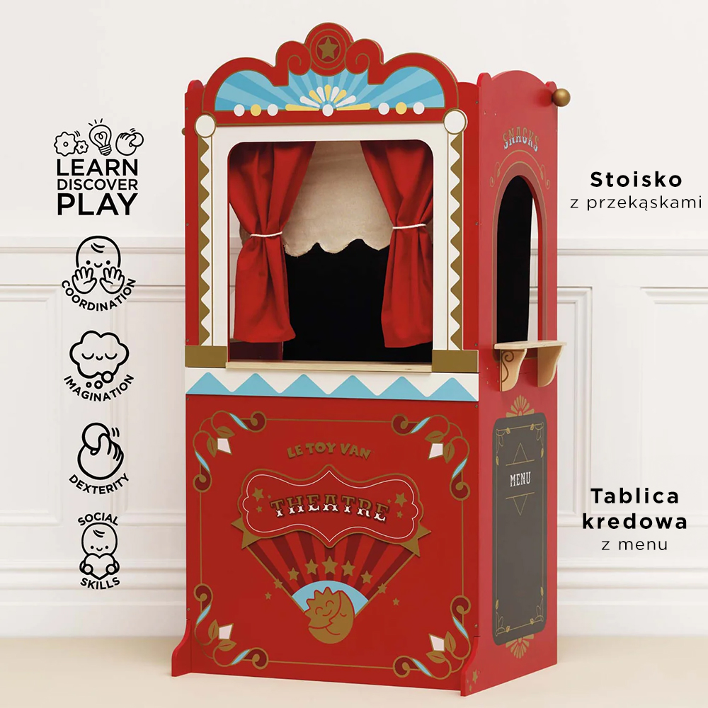 Drewniany teatr uczy dzieci poprzez doświadczanie. Rozwija zaangażowanie w zabawę, umiejętności społeczne, mowę, wyobraźnię i kreatywność. Jest to wyjątkowy i przemyślany prezent na każdą uroczystość. Wyszukane wzornictwo i staranne wykonanie zapraszają Twoje dziecko do eksperymentowania, twórczej zabawy, odgrywania ról i tworzenia zupełnie nowych historii. Łącz z innymi akcesoriami kolekcji Showtime marki Le Toy Van sprzedawanymi osobno.
