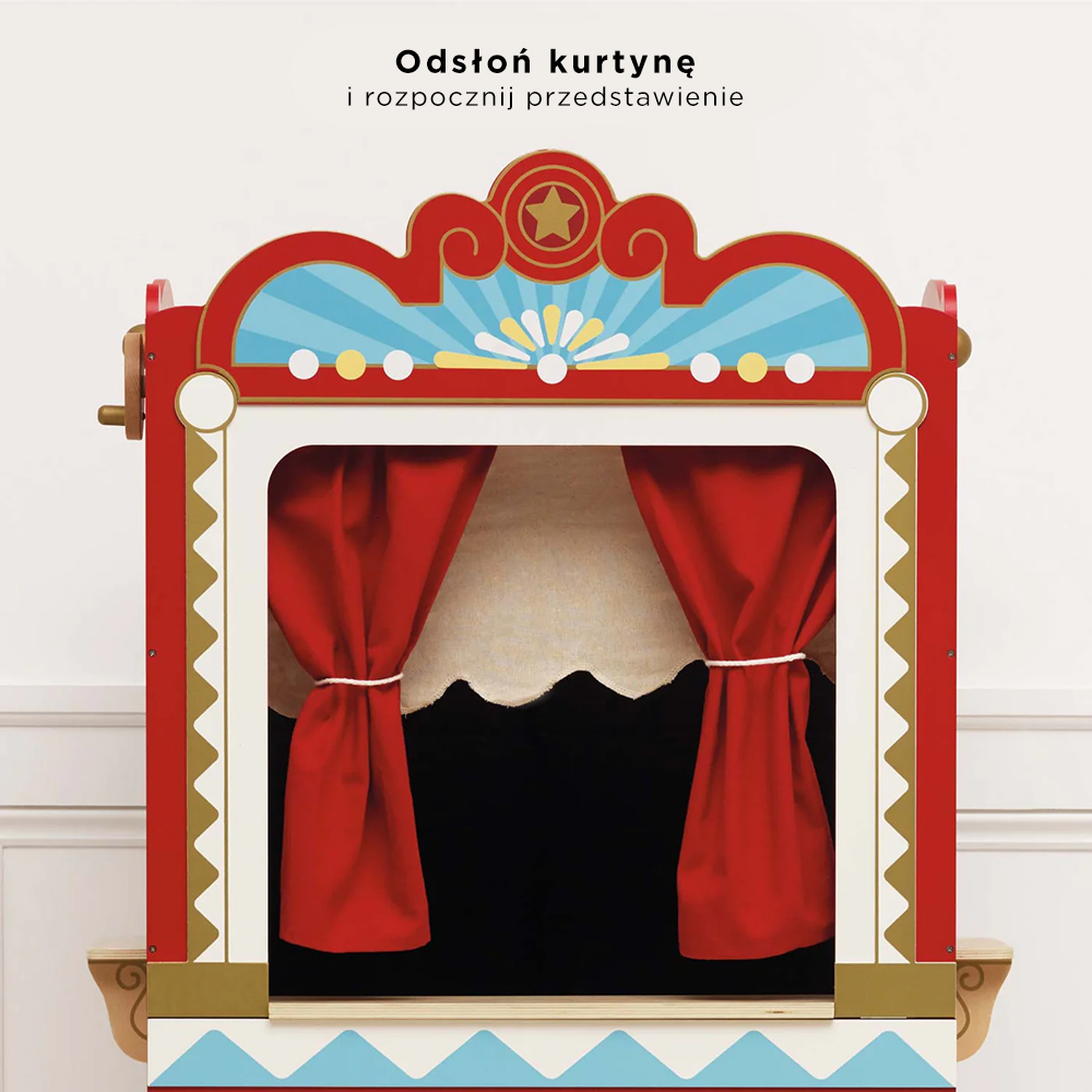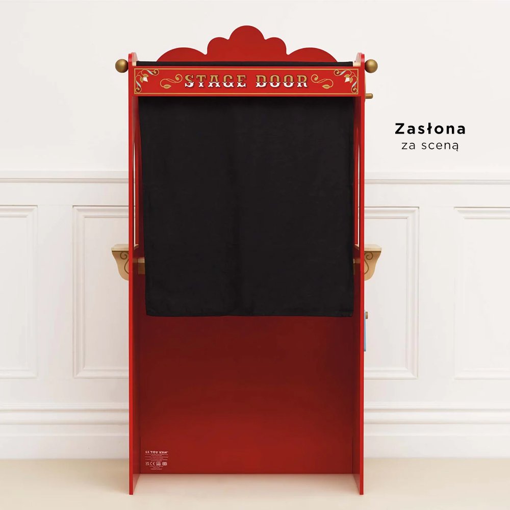 Całość pomalowana na czerwono, ozdobiona pięknymi grafikami z nutą złotej farby, aby każde przedstawienie małych artystów było niepowtarzalne i wyjątkowe. Ta jedyna w swoim rodzaju zabawka została wykonana z solidnego drewna pochodzącego ze zrównoważonych zasobów i pomalowana przy użyciu bezpiecznych dla dzieci farb na bazie wody.