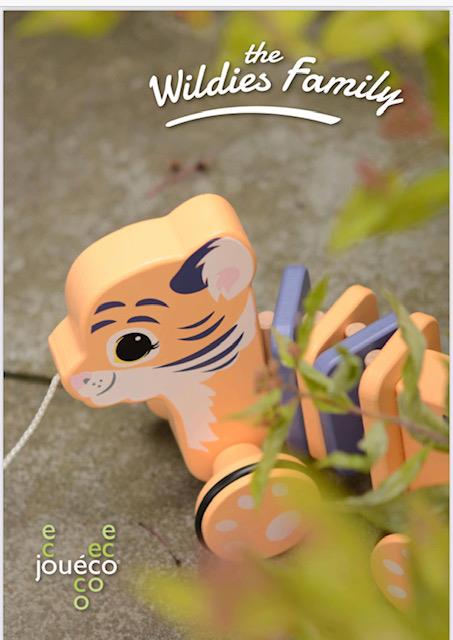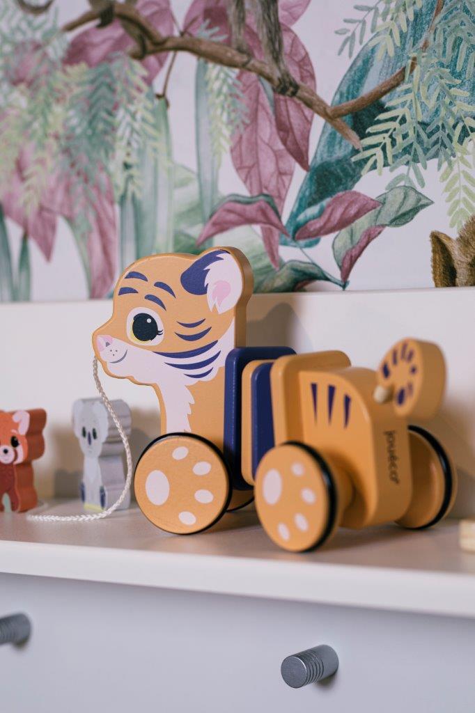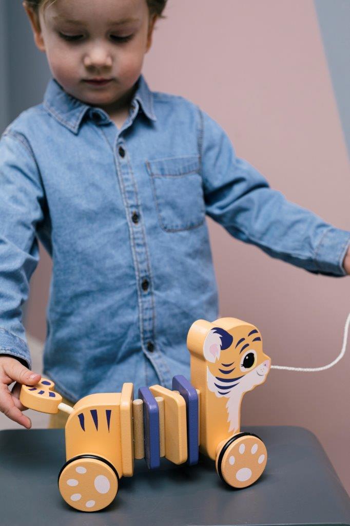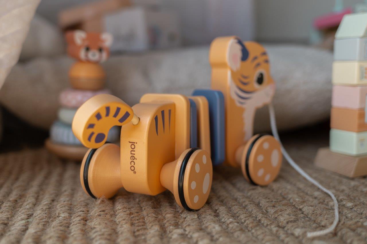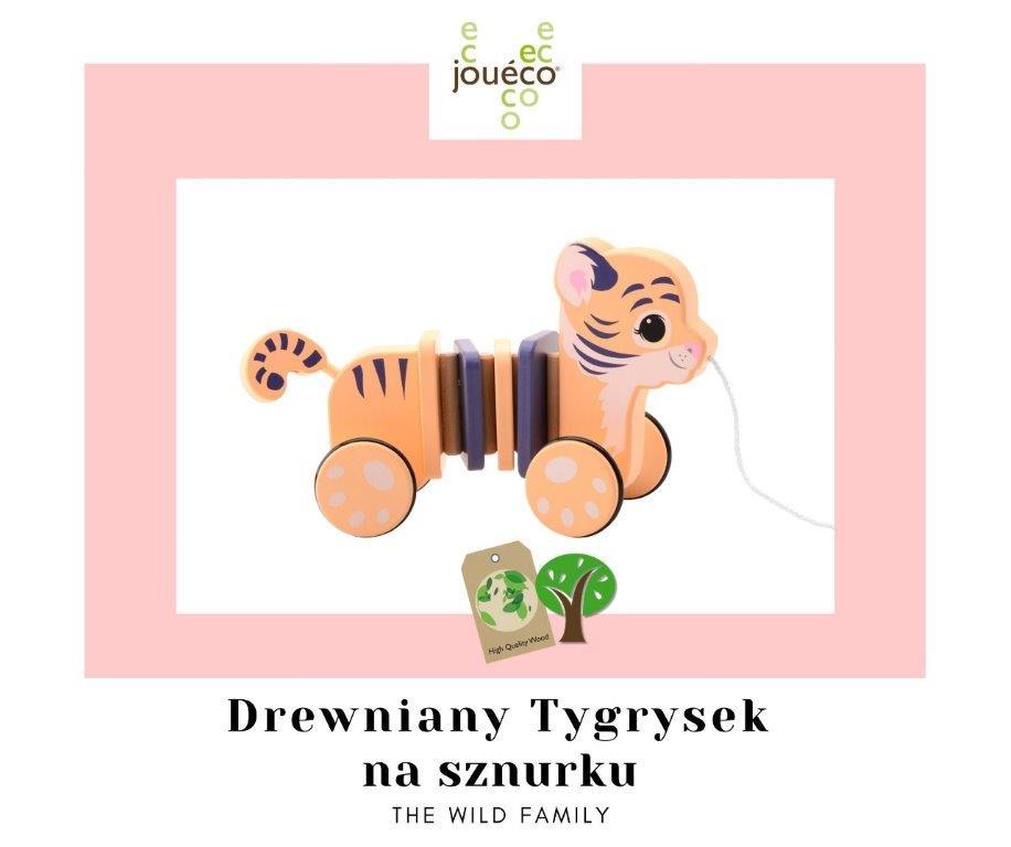 Ten drewniany kolorowy tygrysek to przyjazna zabawka do