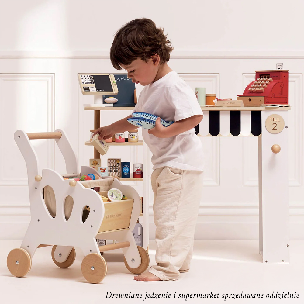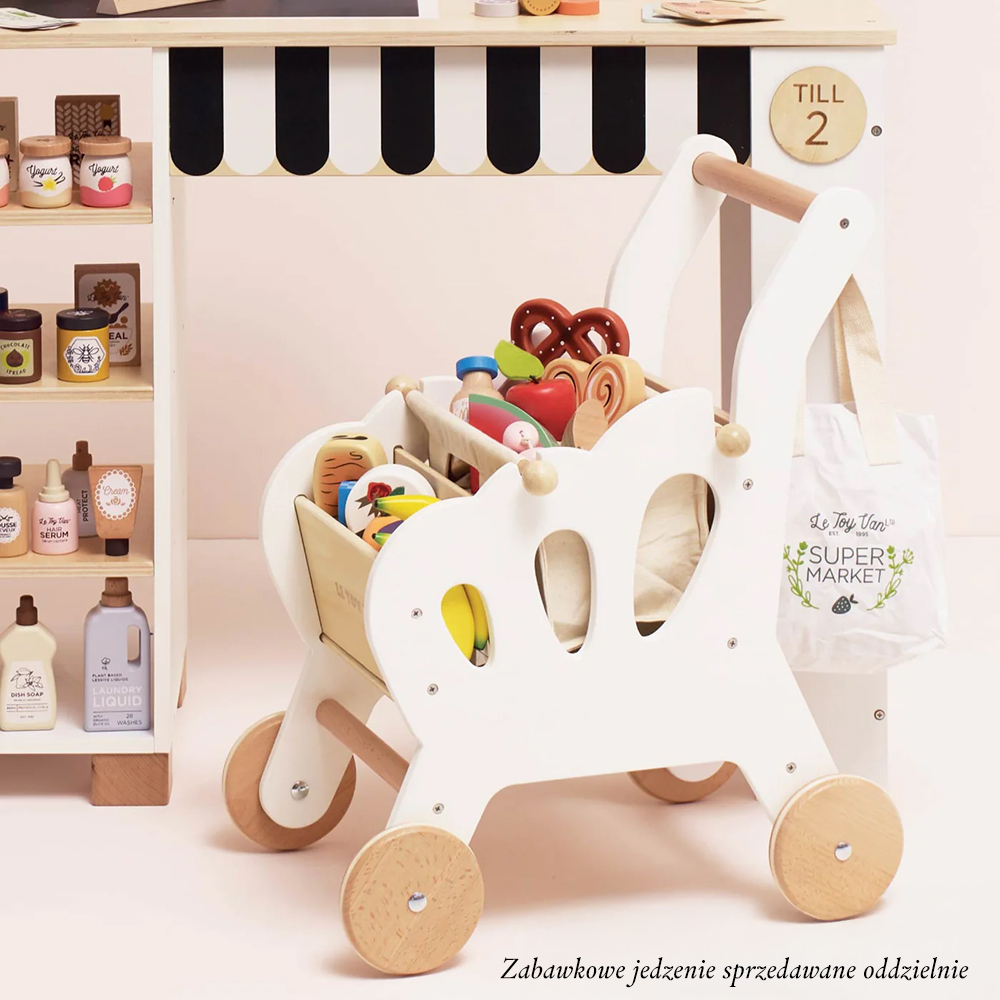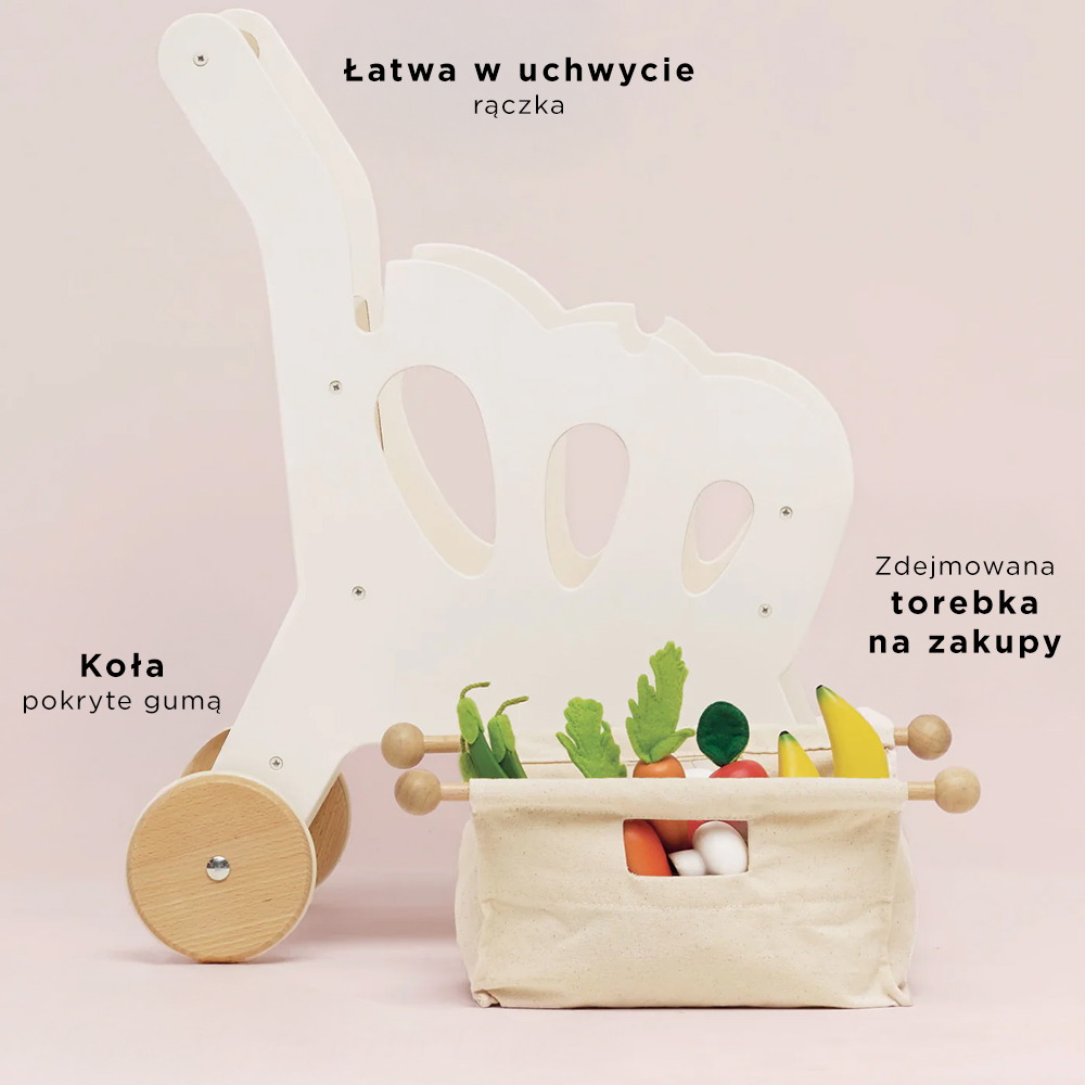 Uroczy drewniany wózek na zakupy dostarcza nowych możliwości zabawy! Ta wielokrotnie nagradzana, angażująca zabawka daje dużo frajdy Twojemu dziecku. Stwórz listę zakupów za pomocą małej tablicy i pakuj produkty spożywcze do wyciąganej materiałowej torby.