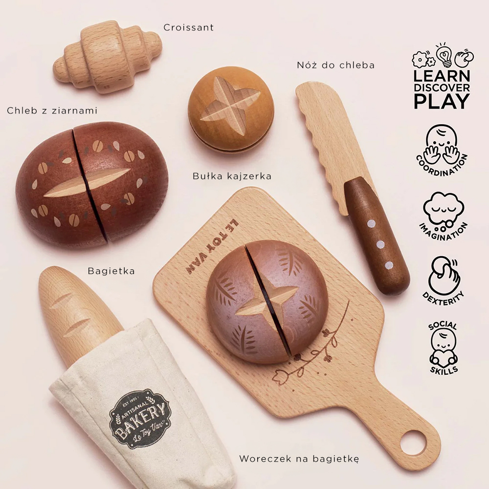 Wyjątkowo realistyczny zestaw pieczywa do krojenia i zabawy zawiera 12 drewnianych elementów: chleb z ziarnami, chleb wiejski, bułkę kajzerkę, croissanta, bagietkę w bawełnianej torbie, deskę do krojenia i bezpieczny nóż. Chleby, bułkę i bagietkę można kroić na połówki, a następnie łączyć ponownie w całość dzięki sprytnym mocowaniom na rzepy.