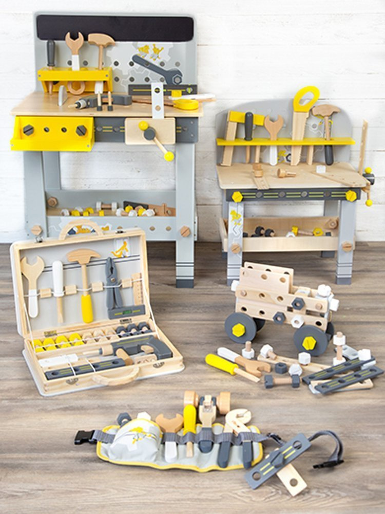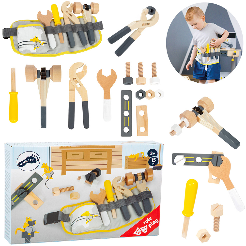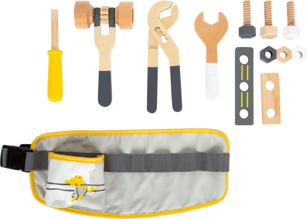 Pasek jako praktyczny uchwyt na narzędzia! Dzięki temu regulowanemu paskowi na narzędzia w klasycznych kolorach warsztatu, mini-rzemieślnicy mają wolne ręce, a ich sprzęt jest zawsze pod ręką! Z realistycznie wyglądającymi narzędziami i akcesoriami, takimi jak śrubokręty, klucze i perforacje wykonane z drewna. Absolutnymi atrakcjami są klucz do rur i grzechotka! W regulowanym pasku narzędziowym kompletne wyposażenie narzędziowe znajduje swoje miejsce i dzięki temu jest zawsze pod ręką!