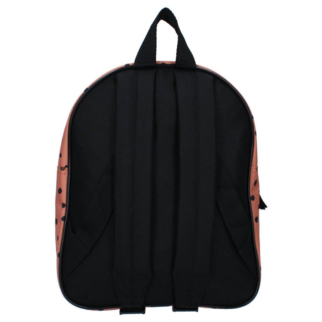 Plecak jest brązowo-karmelowy i ma nadrukowaną buźkę małego kotka.