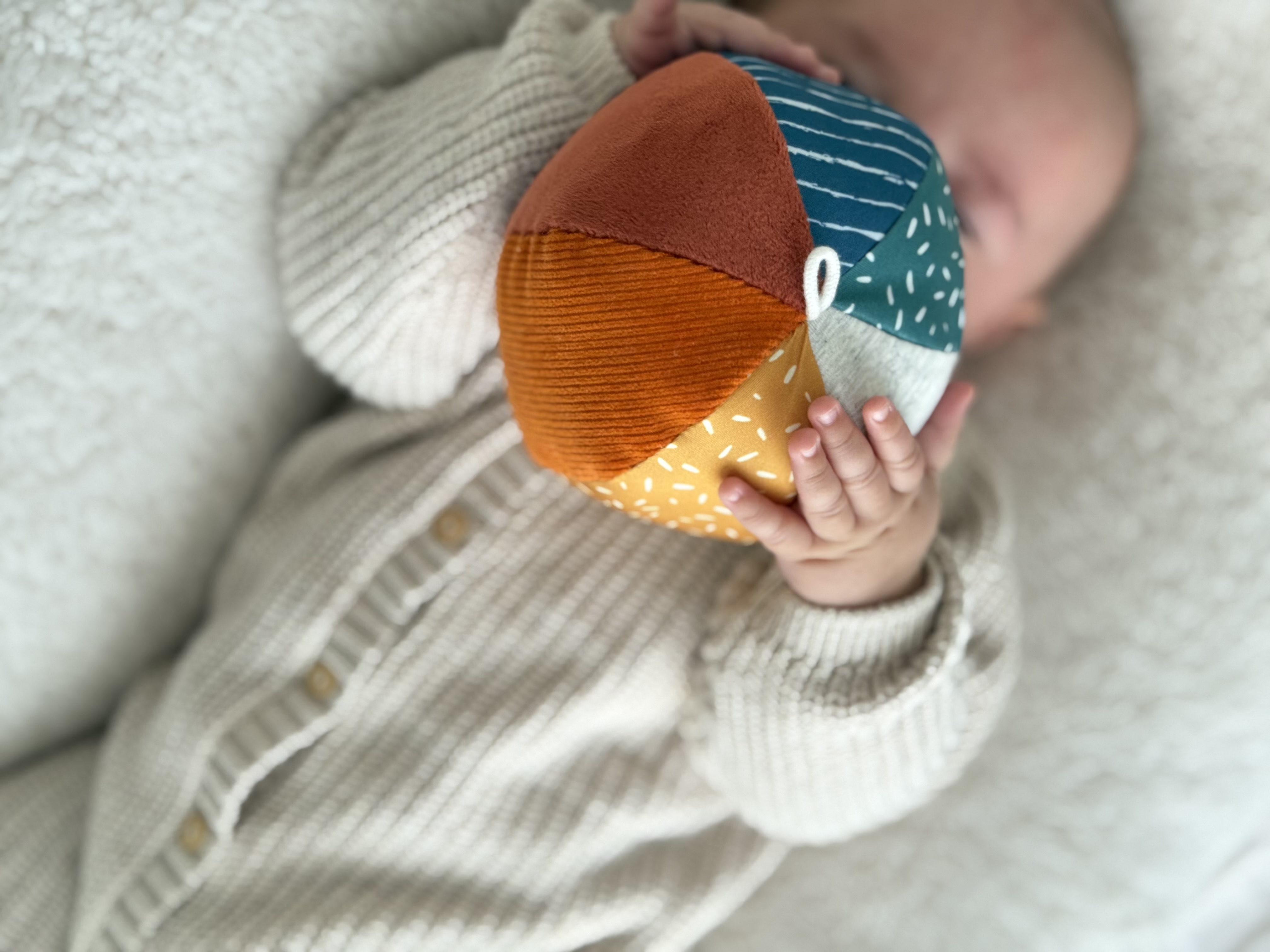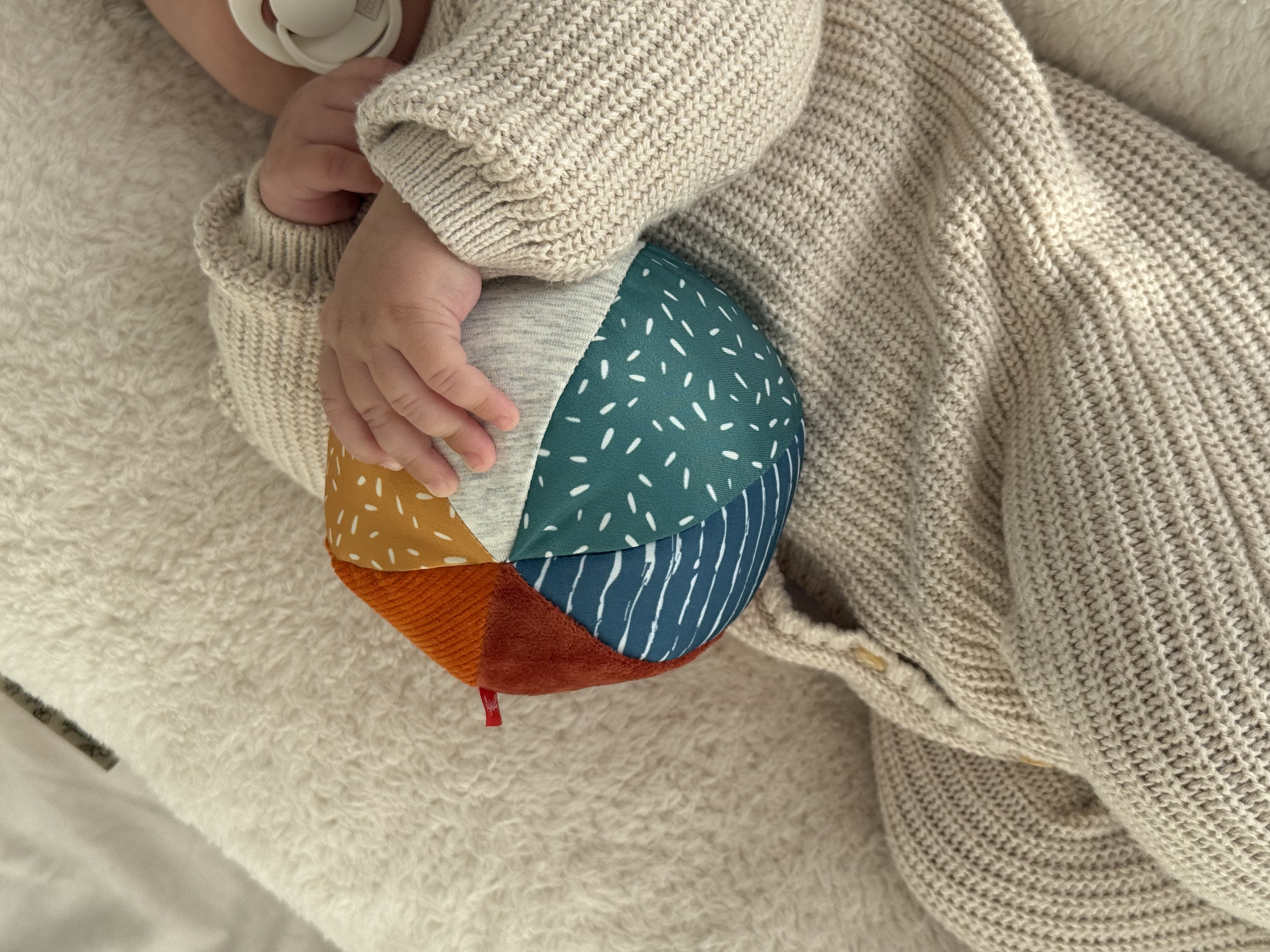 Wyjątkowo miękka pluszowa piłka jest wszechstronną zabawką, która wspiera prawidłowy rozwój motoryczny i sensoryczny maluszka. Wbudowana grzechotka ćwiczy słuch i nagradza próby chwytania. Kolory dbają o prawidłowy rozwój zmysłu wzroku, a różnorodne tkaniny i wzory zapraszają do eksplorowania zabawki z każdej strony.