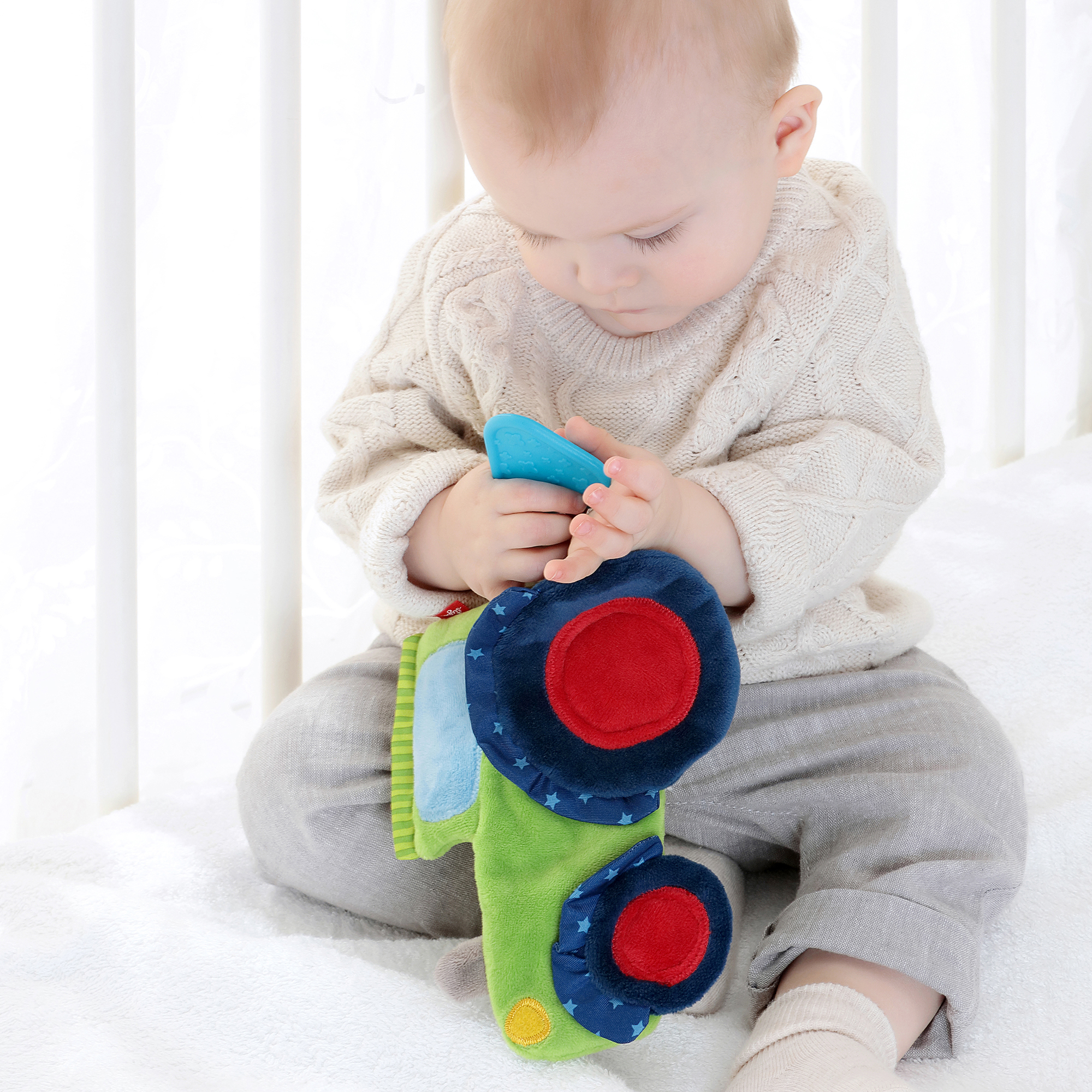 Szeleszczący Traktor ma 18 cm długości, jest odpowiedni dla dzieci od 3 miesiąca życia i można go prać w pralce (gryzaczek można łatwo odczepić przed praniem, dzięki mocowaniu na rzepy).