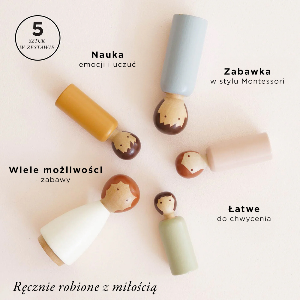 Zachęć swoje dziecko do kreatywnej zabawy w małym świecie lalek z tą kompletną rodziną pięciu uroczych postaci wykonanych z drewna certyfikowanego przez FSC™. Atrakcyjny design, idealnie gładkie krawędzie i staranne wykonanie z uwzględnieniem wszystkich detali sprawiają, że figurki bardzo realistycznie odzwierciedlają prawdziwą rodzinę, w skład której wchodzą rodzice i troje dzieci, dzięki czemu Twoje dziecko będzie miało jeszcze więcej inspiracji do długiej i kreatywnej zabawy.